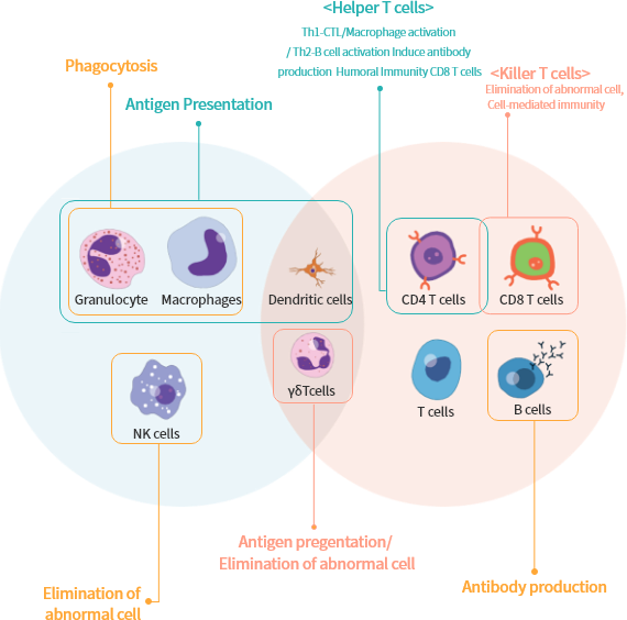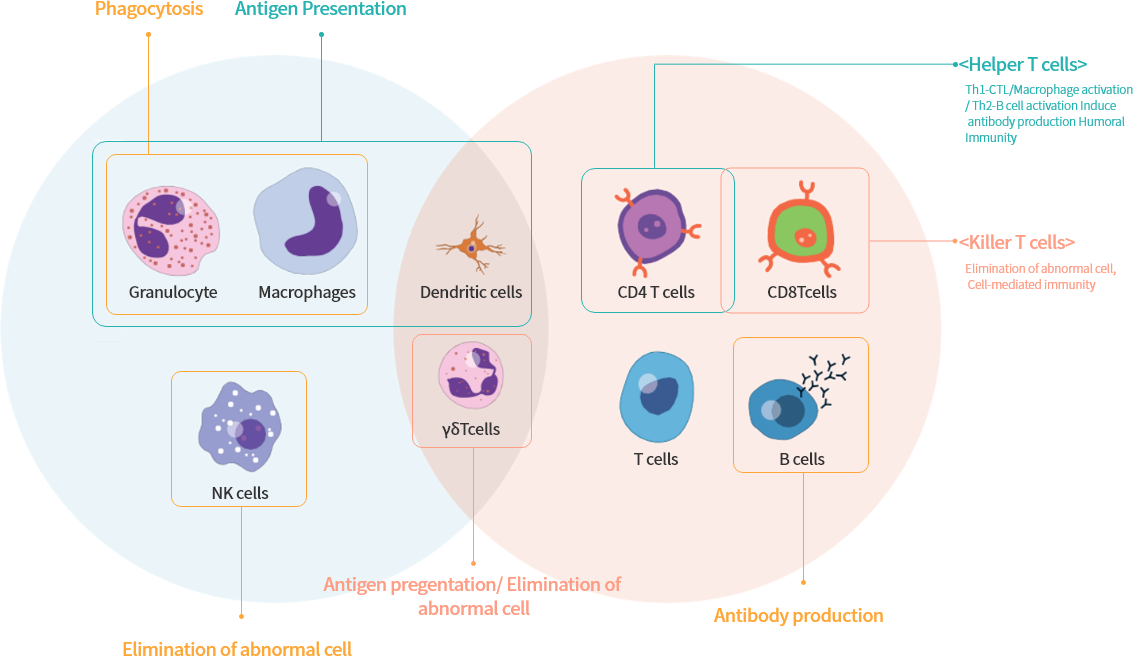 Immunity is the defense of one's body against foreign substances and self-derived substances. It removes foreign substances to acquire immunity and eliminates cancer cells and waste to maintain health. However, if the immunity is insufficient, chronic infectious diseases, cancers, etc. occur and if the immunity is excessive, it leads to allergic or autoimmune diseases. Immune cells are divided into macrophages, NK cells, B cells which are involved in innate immunity, and T cells, B cells involved in acquired immunity, and dendritic cells, and gamma delta T cells, which are involved in both immunity.